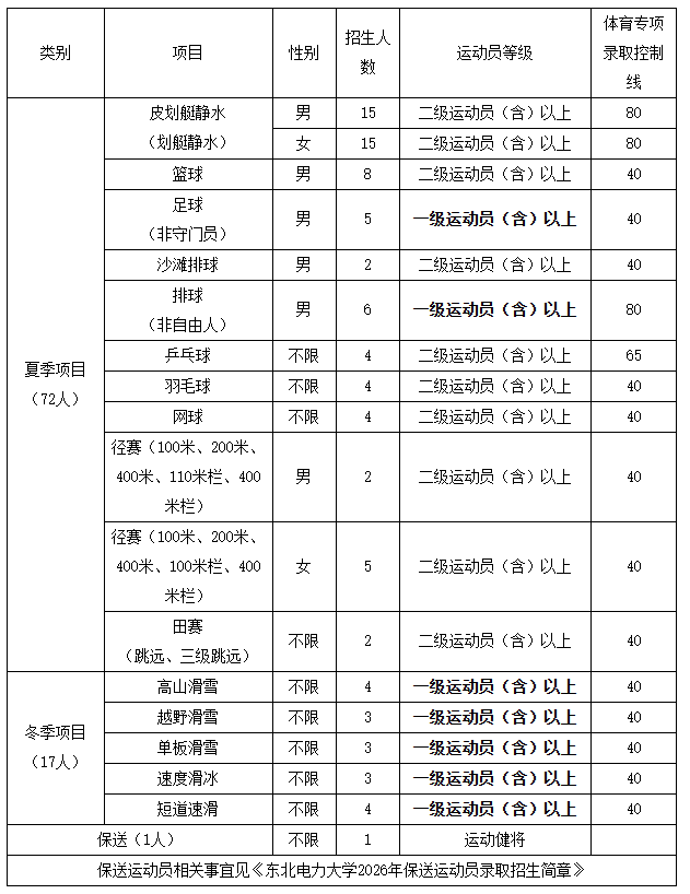 2.具备我校招生项目要求的运动员技术等级称号。考生运动员技术等级以“国家体育总局运动员技术等级系统”公示的数据信息为准。报名考生的等级证书审批日期为:冬季项目为2016年1月1日至2025年12月31日;夏季项目为2016年1月1日至2026年3月10日。